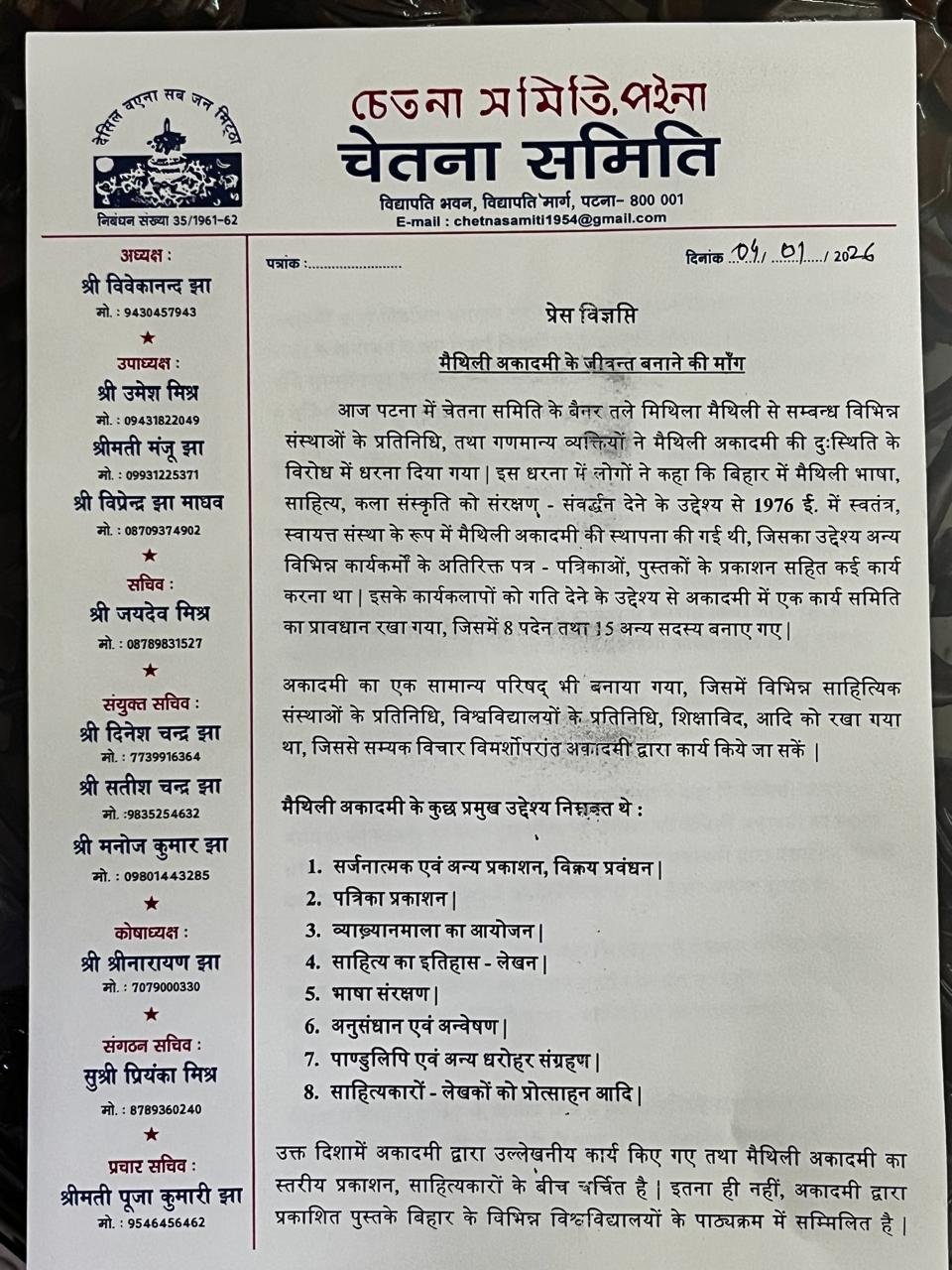 | 1 | मैथिली अकादमी के जीवंत बनाने की मांग 2026 | 04 जनवरी 2026, प्रातः 10:00 बजे |